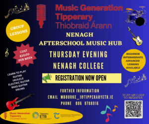Music Generation Afterschool Hub 9th October 2025 tmaguire 🎶 Registration is now open for the Music Generation Tipperary Nenagh Afterschool Hub! Join us and learn from the amazing Peter O’Toole from Hothouse Flowers. Don’t miss out! 🌟#musicgeneration #nenagh @musicgenerationtipperary @tipperaryetb