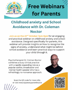 Free Webinar for Parents! Childhood anxiety and school avoidance. 15th October 2025 tmaguire 📢 Free Webinar for Parents! Join Dr. Coleman Noctor for an insightful session on Childhood Anxiety and School Avoidance. 🗓️ October 22nd | 7–8pm Scan the QR code on the poster or visit 👉 www.tipperaryparenthub.ie